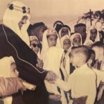 صورة نادرة للملك سعود بن عبدالعزيز خلال افتتاحه أول مدرسة ابتدائية في الدمام ، و بنتها شركة أرامكو في عام 1373 هـ (1954 م)