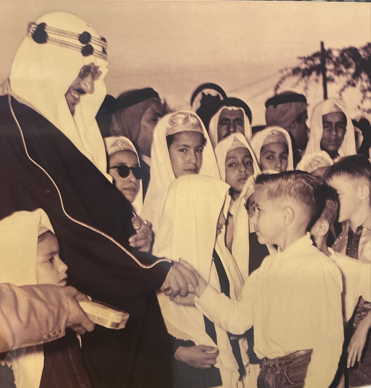 الملك سعود (ولي العهد آنذاك) يسلم على أحد أطفال موظفي أرامكو الظهران عام ١٩٥٣م