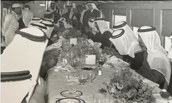 #الملك_سعود رحمه الله على المائدة الملكية المعدّه له في المقطورة الملكية في قطار ( الدمام - الرياض )، ويقف خلف الملك: فهد بن دخيّل ابراهيم بن سبعان ..