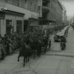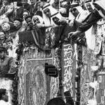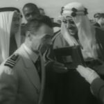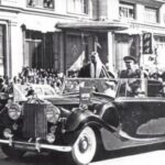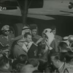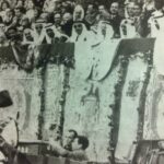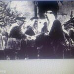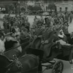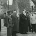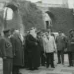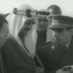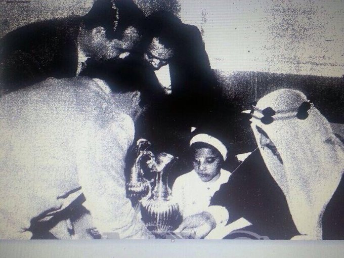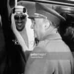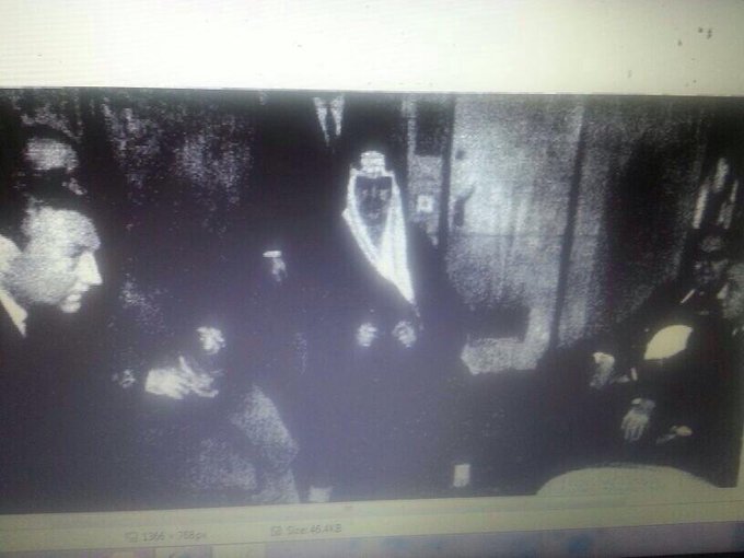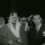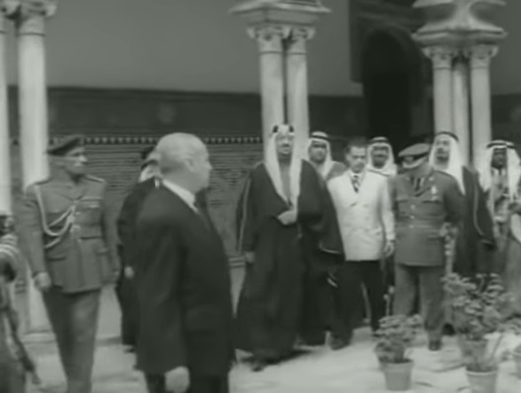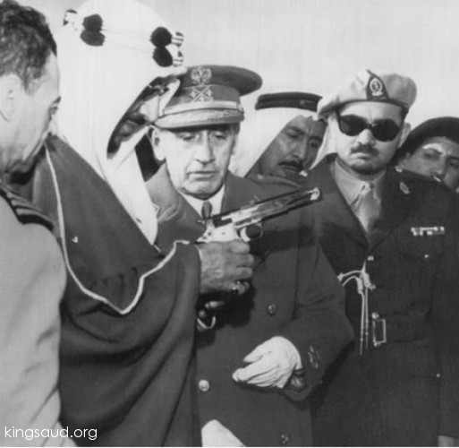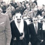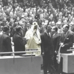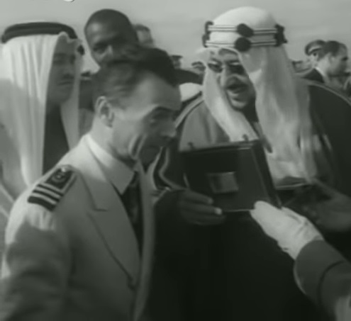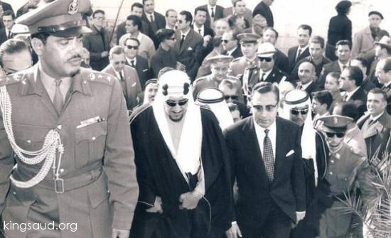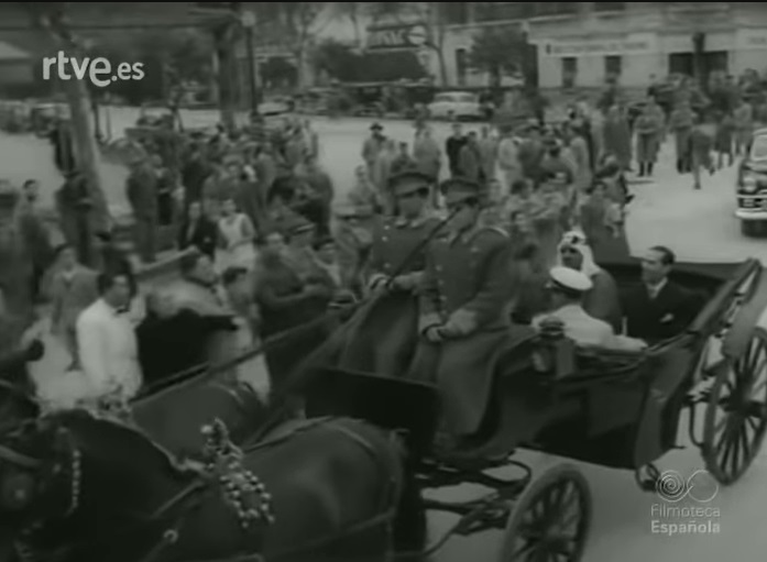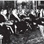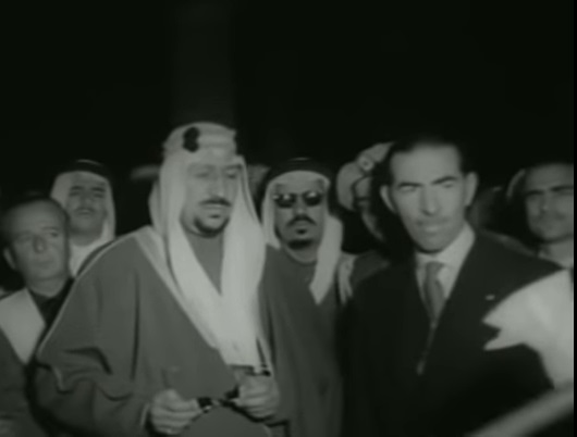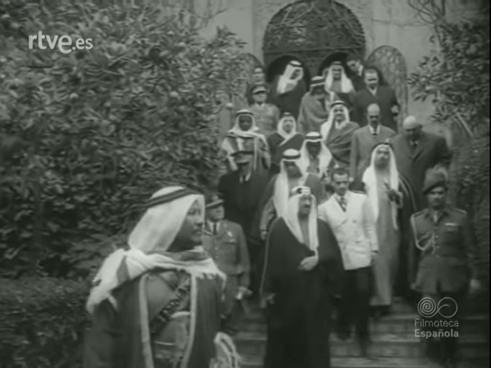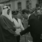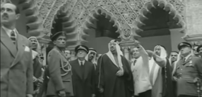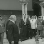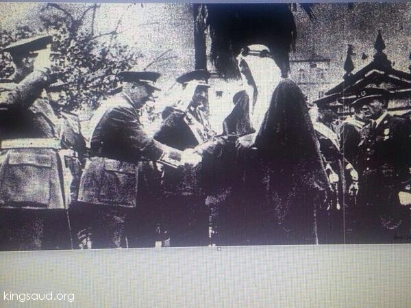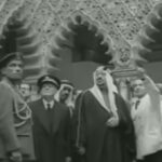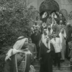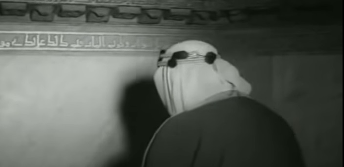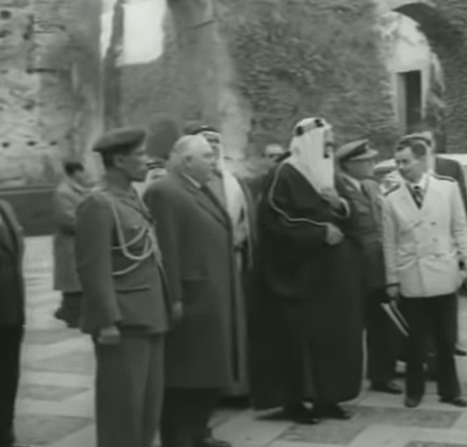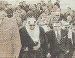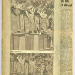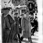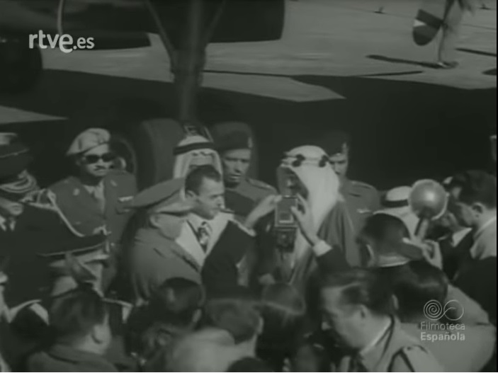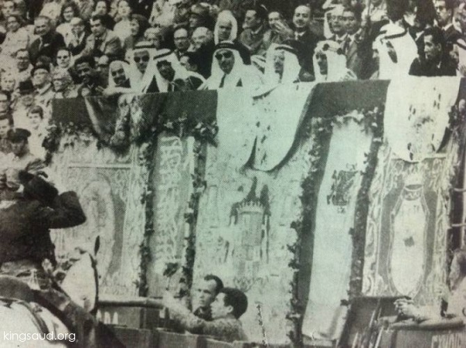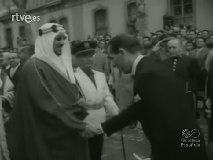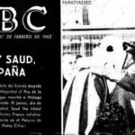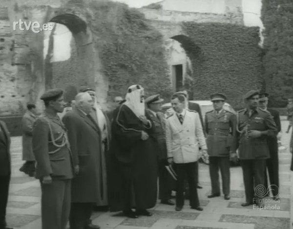 KING SAUD PRAYS TO ALLAH IN THE CORDOBA MOSQUE - Among the cities visited by King Saud I of Saudi Arabia during his recent stay in Spain was Cordoba. These photos offer various moments from his visit to the Cordoba Mosque. Arrival, on the left, Saud I of Saudi Arabia, before the so-called "scented column." Constructed of a rare and mysterious material, the column emits a unique and pleasant aroma when scraped with any hard object. In the other photographs, the King of Saudi Arabia prostrates himself at the oldest part of the Mosque, facing the eastern corner, in the direction of Mecca, and begins his prayers.