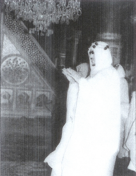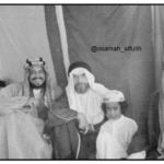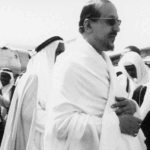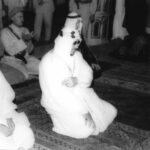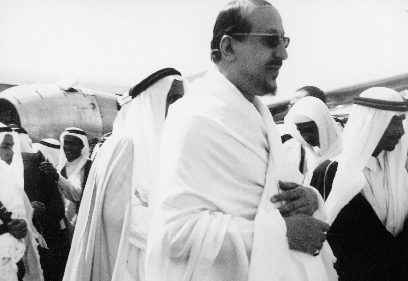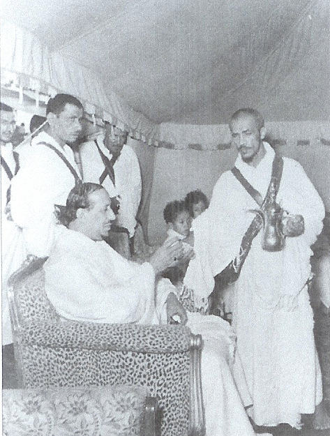 King Saud wearing the clothes of Ihram in his tent during the Hajj season in 1374 AH 1955