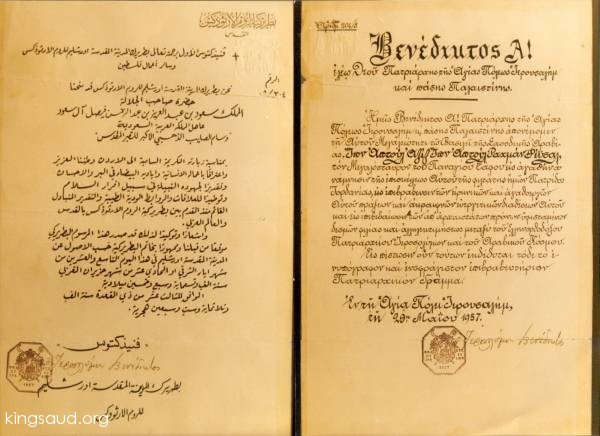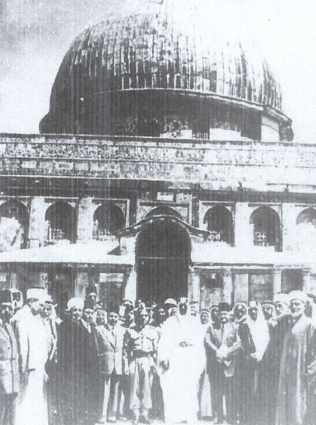 King Saud bin Abdul Aziz and King Hussein of Jordan standing or Dome of the Rock in Jerusalem as the capital of Palestine occupied in 1954 during the visit of King Saud second of Jerusalem