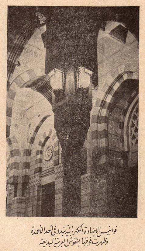 The electric lighting lanterns appear in one of the columns and the magnificent Arabic inscriptions appear on the top