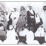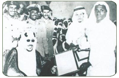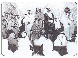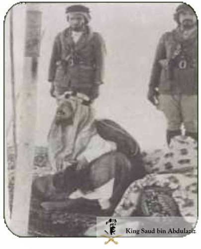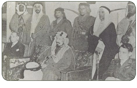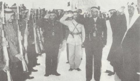 King Abdulaziz, with behind him—on the right—Commander (Colonel) Abdullah bin Nami, and to his left the Deputy Commander (Major) Mansi bin Zaid al‑Baqmi.