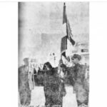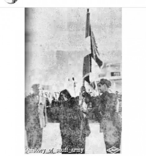 King Saud—may God have mercy on him—raising the Saudi flag at the inauguration of the Saudi Military Academy.